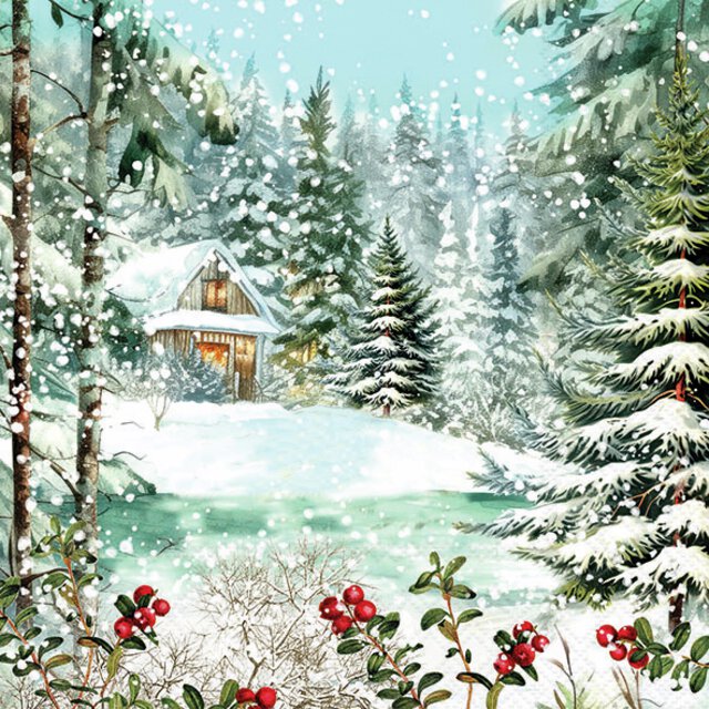 Flot og idyllisk serviet i et frosset skovlandskab.