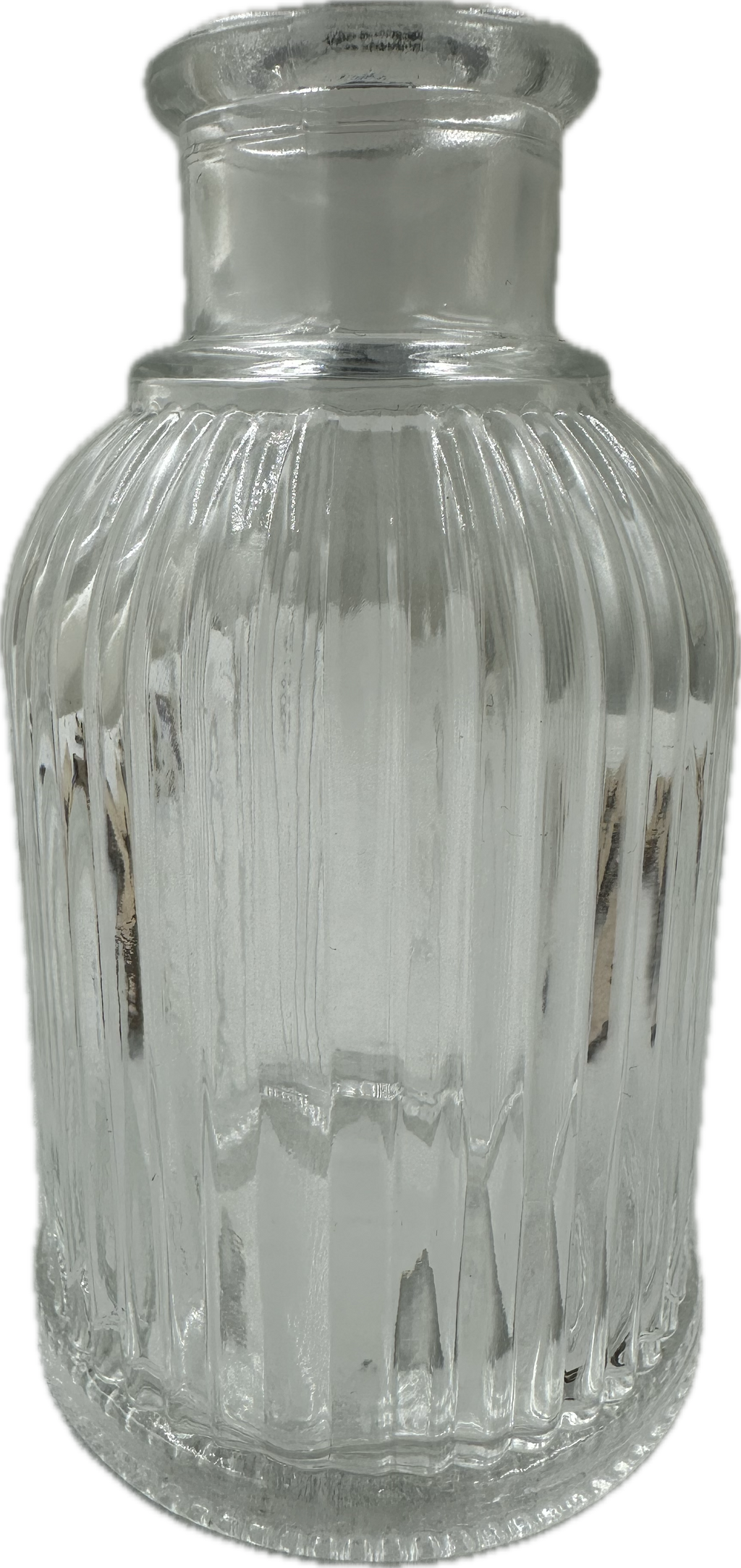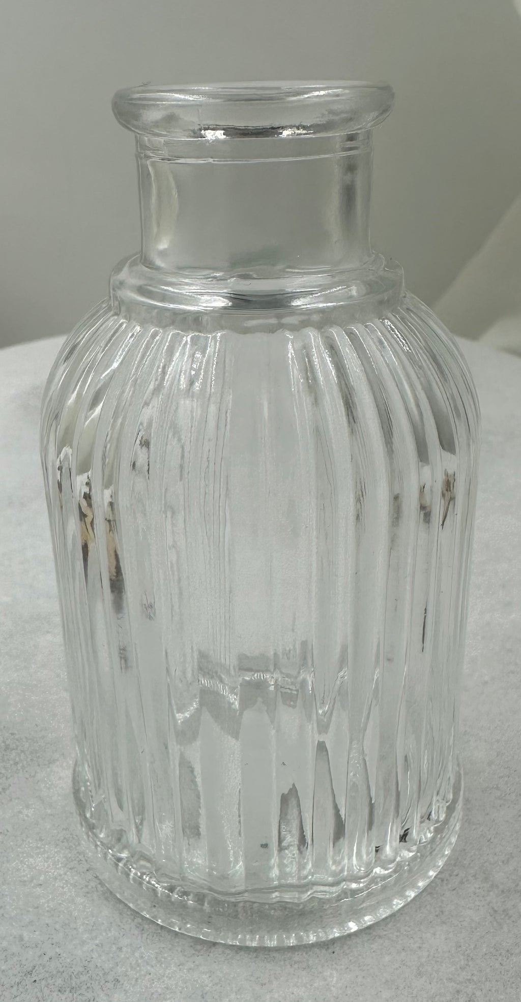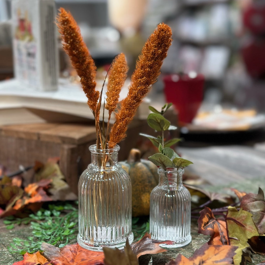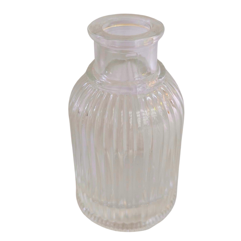 DP Glasvase Rillet, Stor 5,5×9,5 cm er en elegant og enkel glasvase med fine rillede detaljer hele vejen rundt. Vasen passer perfekt til små buketter eller enkelte blomster, og kan bruges både på festbordet, i vindueskarmen eller som en del af en dekorativ opsætning i hjemmet.