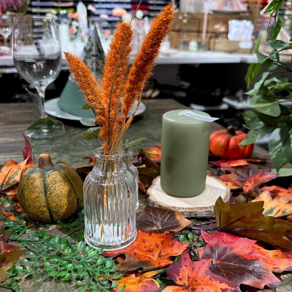 Giv bordet et elegant touch med den rillede vase alene, eller kombiner flere rillede glasvaser for at skabe en flot og personlig borddækning. Pynt med små bånd, blomster eller lys for ekstra charme.