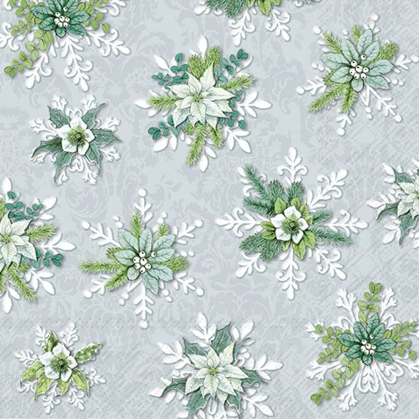 Sød lyseblå frokostserviet med blå og grønne juleblomster på snefnug.