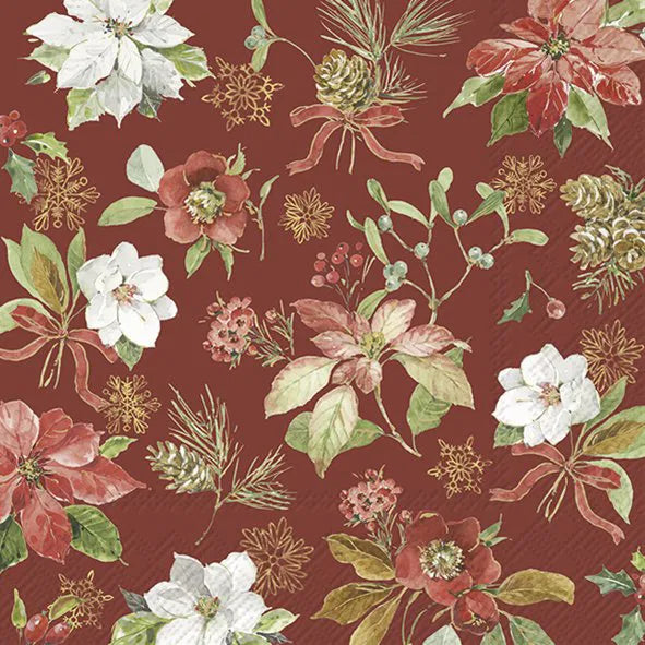 Julestjerner og juleroser på flot bordeaux baggrund.