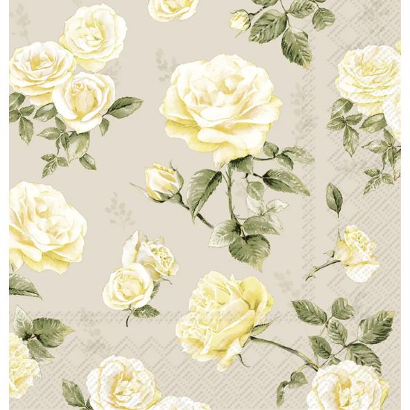 Serviet Frokost Beth Linen 33x33 cm er en elegant cremefarvet serviet med små, fine gule roser og grønne stilke, som tilføjer et friskt og romantisk touch til borddækningen. Servietten er fremstillet i 3-lags kvalitet, hvilket giver både styrke og absorbering, så den kan bruges både som pynt og praktisk serviet.