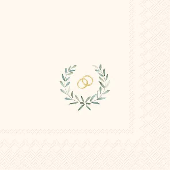 Elegant frokostserviet med guldringe omkranset af bladranke, perfekt til bryllupper