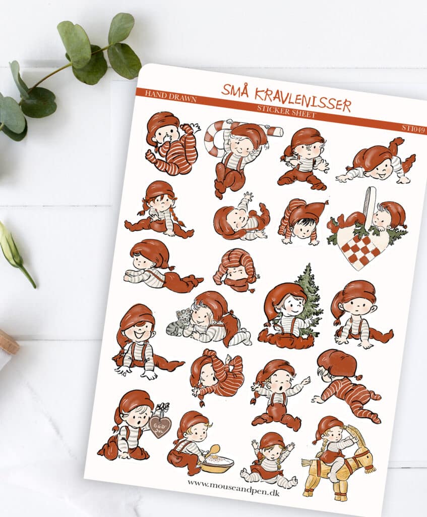 Pynt julekort, bordkort eller invitationer med disse juleklistermærker med søde kravlenisser i røde og hvide farver fra Mouse & Pen.